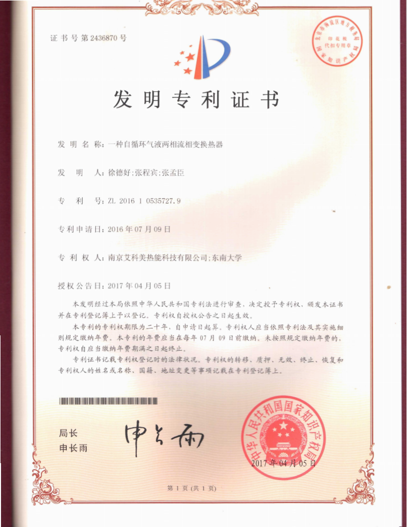 發(fā)明專利——一種自循環(huán)氣液兩相流相變換熱器