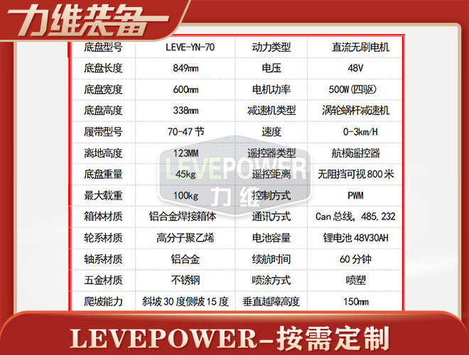 橡膠履帶底盤長(zhǎng)849mm,履帶底盤寬600mm,履帶底盤高338mm,無線遙控履帶底盤搭載48V500W直流永磁無刷電機(jī),RV渦輪蝸桿減速機(jī)動(dòng)力更強(qiáng),爬坡更有勁。