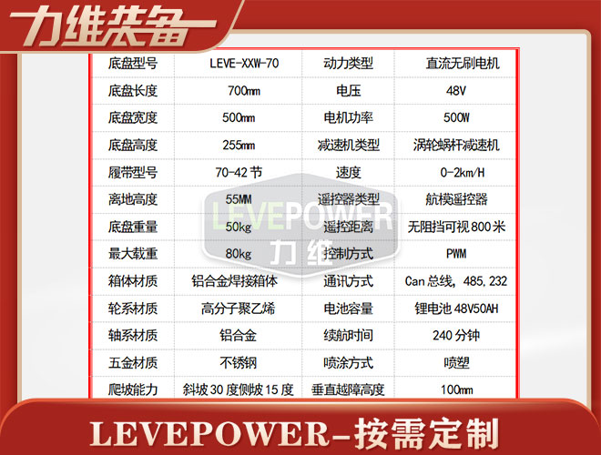 履帶底盤長700mm,履帶底盤寬500mm,履帶底盤高255mm,無線遙控履帶底盤箱體采用鋁合金材質焊接而成,防腐性能好。履帶底盤動力采用48V500W直流無刷電機,渦輪蝸桿減速機動力更強,轉彎靈活,爬坡性能穩定。履帶底盤電池采用48V50AH鋰電池,續航時間更長,是一款不錯的機器人橡膠履帶。