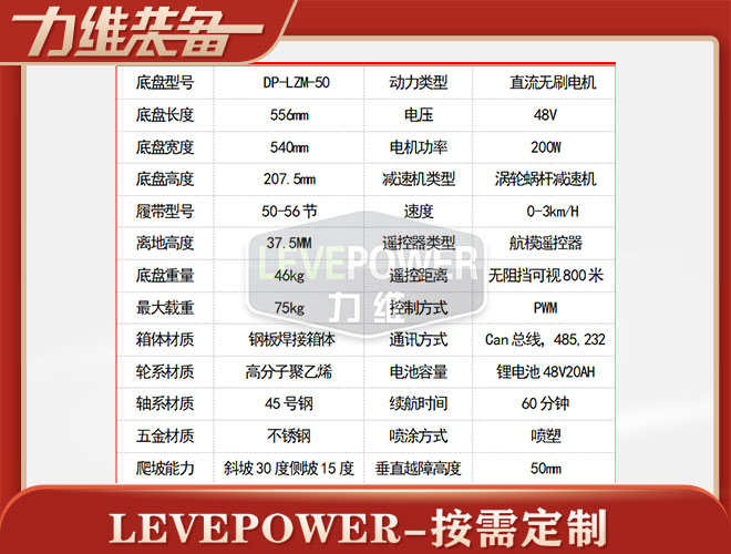 橡膠履帶底盤長556mm,橡膠履帶底盤寬540mm,橡膠履帶底盤高207.5mm,無線遙控履帶底盤采用48v200W直流無刷永磁電機,渦輪蝸桿減速機動力更強,轉彎靈活,操控簡單。履帶底盤電池采用48V20AH鋰電池續航時間更長。履帶底盤箱體采用鋼板焊接而成,輪系采用高分子聚乙烯,履帶底盤整體重量輕,耐磨性強。